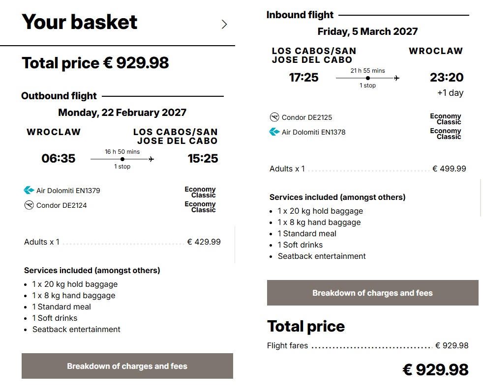Przykładowa rozpiska połączenia Wrocław – Los Cabos Airport – Wrocław = LINK